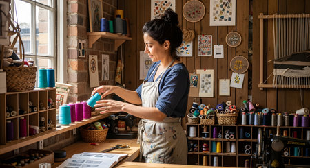 A female seamstress arranges colorful spools of thread in her rustic sewing workshop. The room is filled with creative tools like a sewing machine, loom, and embroidery art, highlighting the dedication to textile crafts and handmade fashion.