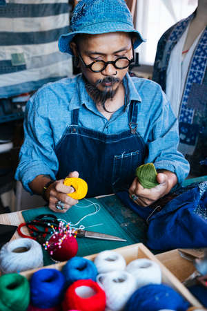 A man in blue clothes, hat and apron select the colorful thread to fix the clothes.