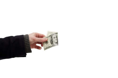 Hand giving dollar money, close-up. Hands holding a dollar bills on white background with copy space. Salary, earning and savings concept