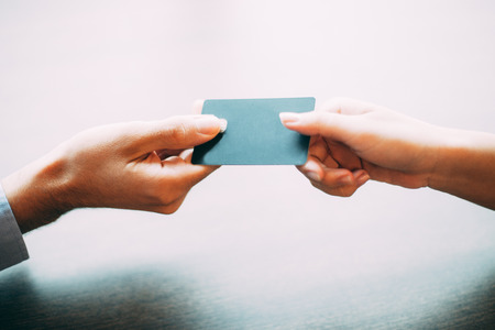 blank white card passed between hands. women exchange business cards, business meeting. Networking concept