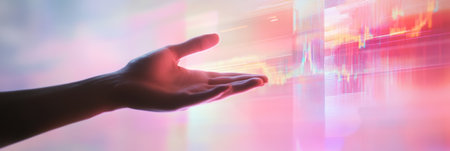 Open hand interacting with holographic financial charts, representing investment analysis, market trends, and strategic decision making in the financial world