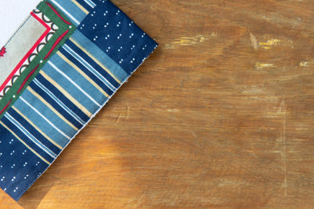 top view with blue kitchen napkin isolated on table background. Folded cloth for mockup with copy space, Flat lay. minimal style.