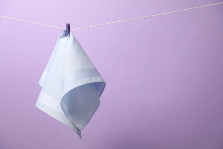 Beautiful cotton handkerchief hanging on string against lilac background. Space for text