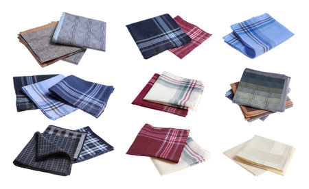 Folded red and blue checkered bandanas on white background, flat lay. Space or text