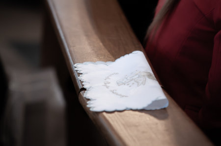 White Communion Napkin With Dove Motif On Wooden Church Pew Religious Detail