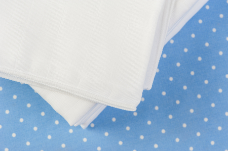 Stylish white handkerchiefs on light blue background, flat lay. Space for text
