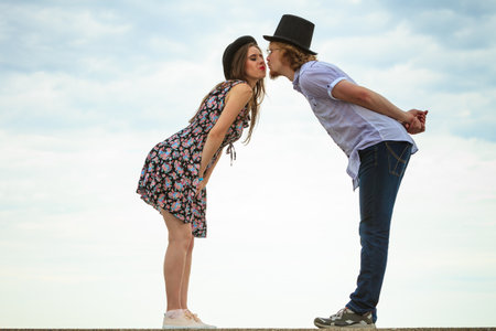 Summer happiness love relationship and dating concept. Young romantic playful couple flirting kissing on date against sky background