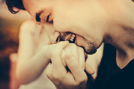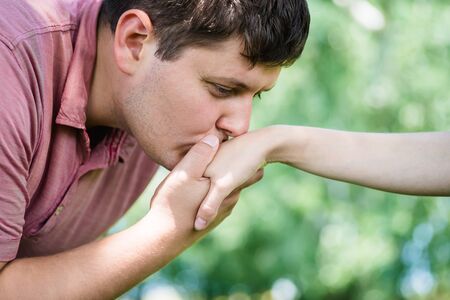 Polite man, husband kissing woman hand palm. Good, happy relationship. Love couple concept.