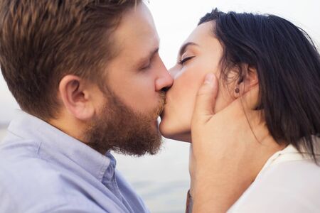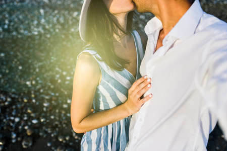 Kissing beautiful happy couple, cropped horizontal. Honeymoon of young happy couple. Family on holiday. Concept idea background. Romantic man and woman on beach and sea or ocean. Self-portrait dating.