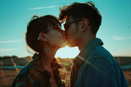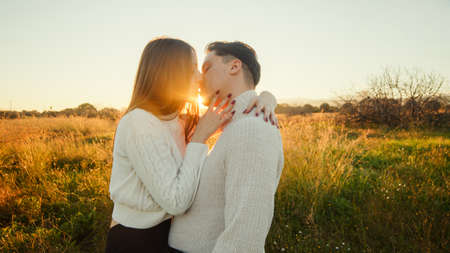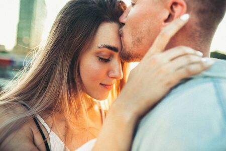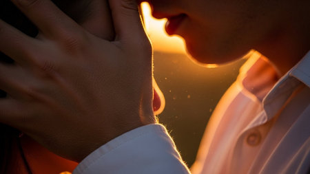 Man tenderly embraces woman in a close-up profile. Their faces are illuminated by beautiful warm sunset light outdoors, intimate moment.