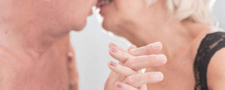 Elderly couple is passionately kissing with clasped hands
