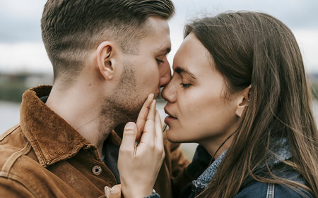 Man kissing his girlfriend to the chin