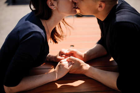 Couple kissing at the restaurant table outdoor