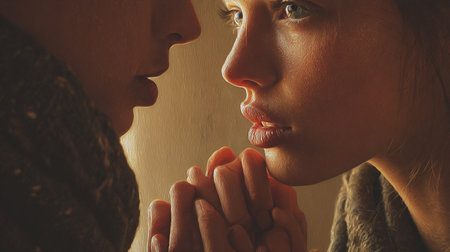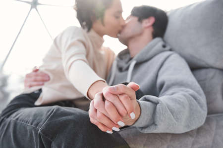 Close-up portrait of a young couple in love holding hands and looking at each other