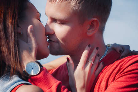 Amorous couple kissing on a background of blue sky.