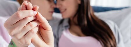 Selective focus of same sex couple holding hands on bed, panoramic shot