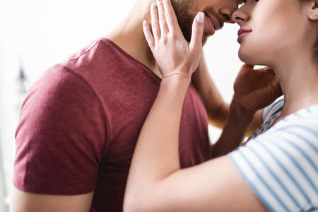 cropped view of happy beautiful young couple hugging at home
