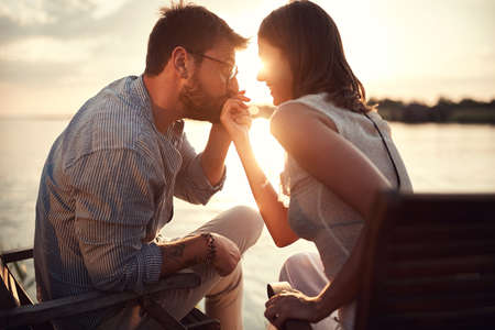 close up of young beardy man holding and kissing hand of a woman beside the river at sunset