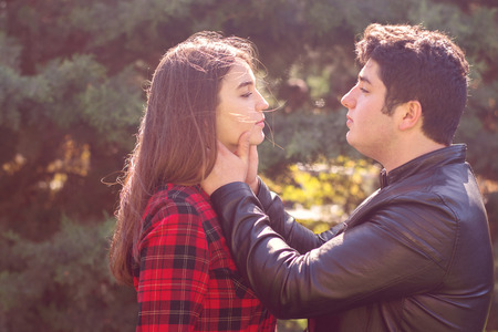 Young lovers kissing stands ready to join hands to form a heart in the park. Teen couples show love to each other in the park. Concept of young couple in the park.