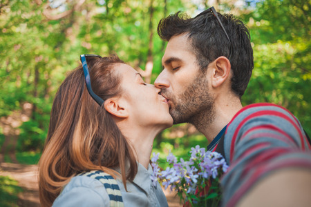 Young couple in love taking a selfie while kissing in the park