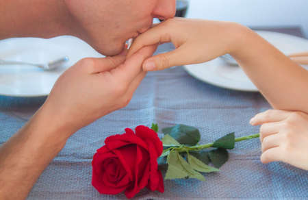 adult husband kisses the hand of his wife.