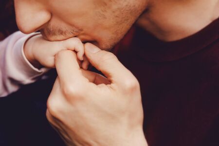 Closeup of a happy young father kissing his charming newborn baby. Concept of love is father's day and love of children.