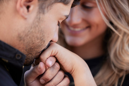 Love, man kiss hand of woman and celebration for marriage, relationship and happiness for romance. Romantic, couple and gesture for joy, Valentines day and bonding together, loving and achievement