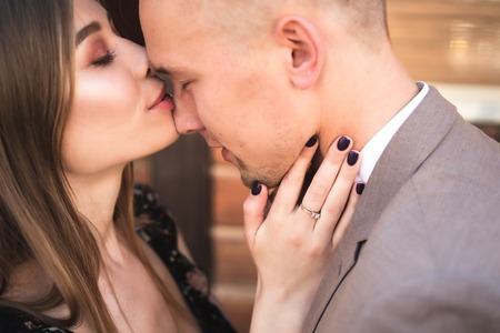 Portraits of a newly married couple. The wedding couple is kissing, hugging on the background of the order. Lovers are happy.