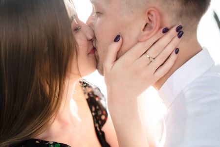 Sensual kiss of young caucasian man and woman