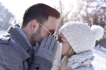 A young attractive couple kissing behind gloved hands in a snowy park