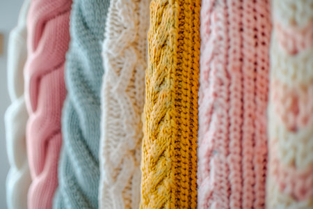 Professional digital artwork featuring intricate knitted wool texture in gentle pastel tones, evoking a comforting winter mood with fuzzy warm illumination. Ideal for textile designs, seasonal packaging, apparel graphics, and lifestyle branding in fashion and home decor sectors. Versatile for invitations, promotional materials, and digital mockups. . AI-generated digital illustration. AI-generated illustration.