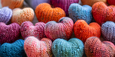 Colorful knitted hearts made from wool. Concept DIY Craft, Handmade Decor, Knitting Inspiration, Heartfelt Creations