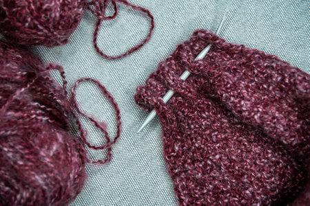Hand knitting sock with needles and yarn ball.