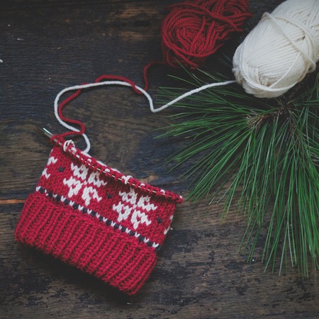 Unfinished knitted cap on knitting needles on a wooden background