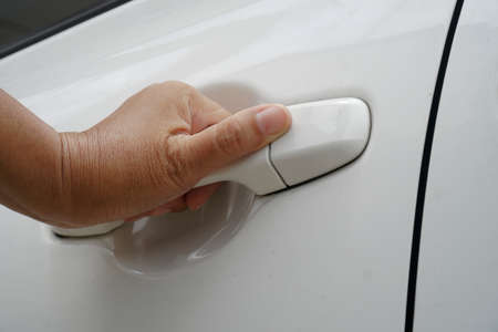 woman's hand opens white car door. close up.