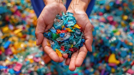 Closeup at caucasian hands full of colorful plastic bottle cups, handful of waste of plastic lids.