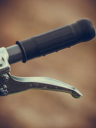 Machinery, vehicle details concept. Detailed closeup of bike steering wheel with brake