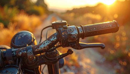 Rusty motorcycle handlebars and controls in warm sunset light on a dirt road with bokeh.