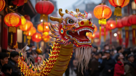 A crowd gathers to watch a stunning dragon dance performance featuring a beautifully adorned dragon. Red lanterns illuminate the festive atmosphere, celebrating lunar new year.