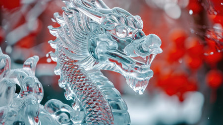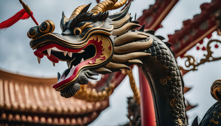 Detailed sculpture of a Chinese dragon with bright red elements and a lantern against the backdrop of traditional oriental architecture. Symbol of luck, tradition and Asian culture.