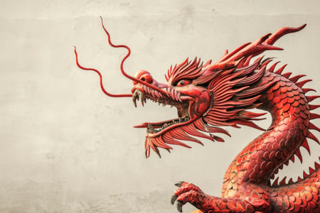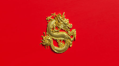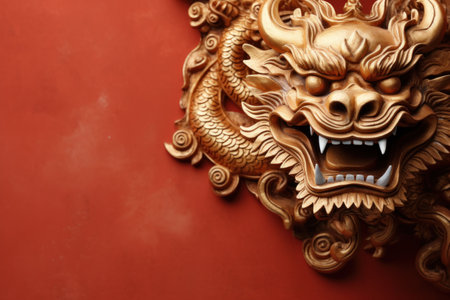 A magnificent golden dragon winds elegantly against a bold red background, showing intricate scales and detailed facial features, embodied cultural symbolism and artistic mastery.