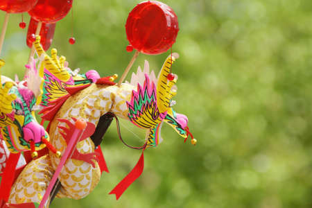 A close-up of a Chinese dragon dance prop with vibrant colors. No people, copy space.