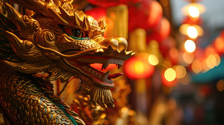 A golden dragon statue paired with glowing lanterns and vibrant red accents