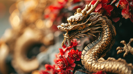 Stunning golden dragon sculpture surrounded by lush flowers on marble. Perfect for adding an artistic and vibrant touch to your interior decor.