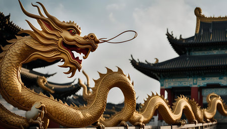 A golden dragon statue stands majestically in front of a traditional Chinese temple. The intricate details of the dragon's scales and claws are visible, as is the temple's ornate roof and colorful decorations. The statue symbolizes power, wisdom, and good fortune in Chinese culture.
