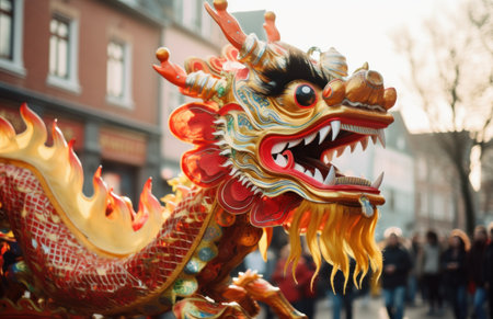 chinese dragon mask in chinese lunar new year parade, closeup of photo