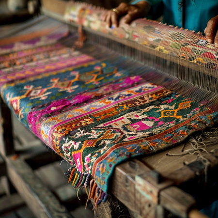 Skilled artisan meticulously weaving vibrant threads, creating a beautiful textile on a traditional wooden loom
