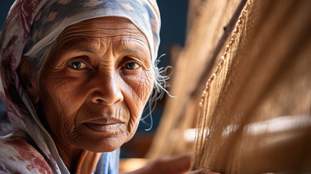 Elderly female artisan is weaving detailed patterns on a loom, with vibrant yarns in the background, highlighting the beauty of traditional textile craftsmanship, AI generated