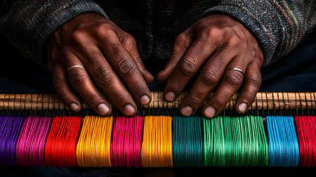 Hands weaving colorful threads on a loom, crafting intricate patterns