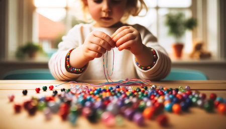 Meticulous hands of an 8-year-old girl as she threads colorful beads, creating intricate bracelets. The brightness of the scene enhances the vivid colors of the beads and the youthful creativity that shines through her focused activity.